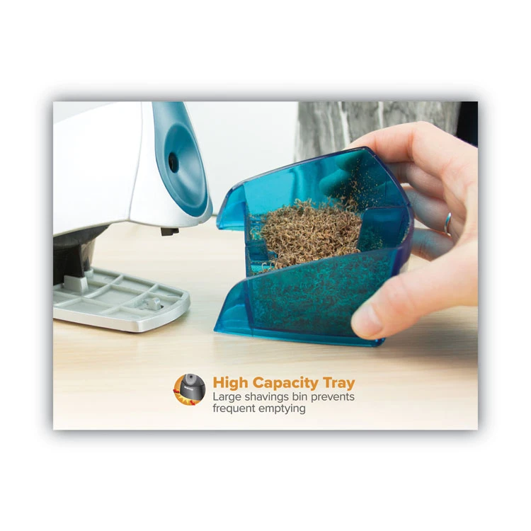 - Safety switch prevents sharpener use when shavings tray is removed.