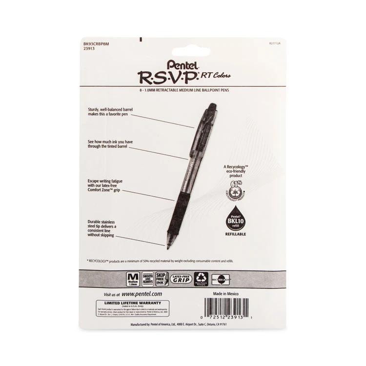 SKU: PENBK93CRBP8M Category: Pens Tags: 8/Pack, Assorted Ink Colors, Clear Barrel, Medium 1 mm, R.S.V.P. RT Ballpoint Pen, Retractable