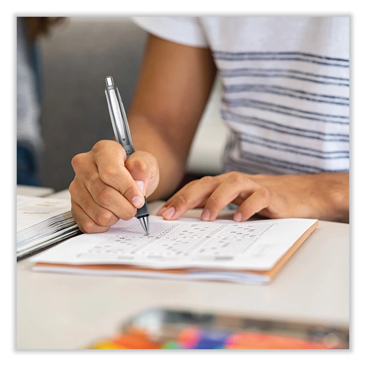 Designed with perfect weight distribution for comfortable, balanced writing. Contoured, wide double-layer grip and balanced gripping axis reduce writing stress and alleviate hand fatigue. Ink is extra long-lasting and provides an ultra-smooth writing experience. Recommended for Ease-of-Use by the Arthritis Foundation®. Silver-toned barrel with colored grip and metal accents. Retractable and refillable for continued use.