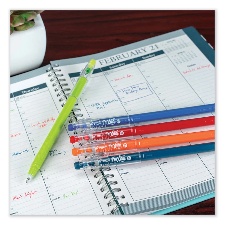 Lets you write in vivid color. Modern and slim design with a non-slip grip. Erasable gel ink pens write smoothly and erase cleanly without any wear and tear to the paper or messy eraser shavings. The heat generated by erasing FriXion causes unique thermo-sensitive ink to become clear so the writing disappears from the page, allowing you to erase and rewrite repeatedly without damaging documents. Eraser on a clear, non-rolling cap for ease of use.