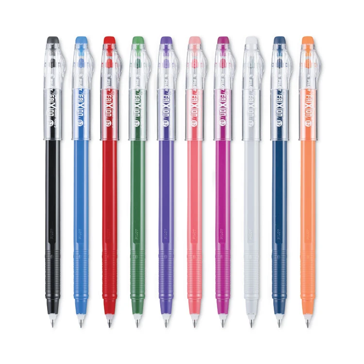 Lets you write in vivid color. Modern and slim design with a non-slip grip. Erasable gel ink pens write smoothly and erase cleanly without any wear and tear to the paper or messy eraser shavings. The heat generated by erasing FriXion causes unique thermo-sensitive ink to become clear so the writing disappears from the page, allowing you to erase and rewrite repeatedly without damaging documents. Eraser on a clear, non-rolling cap for ease of use.