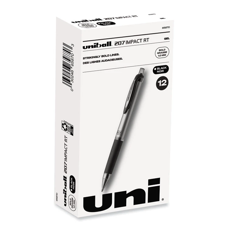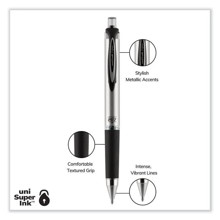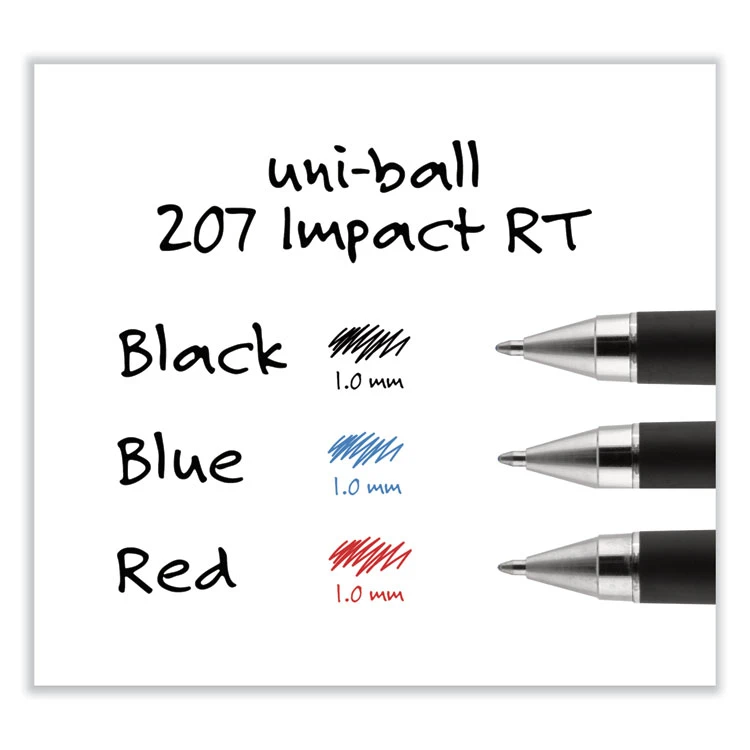 Make an impact with 207 IMPACT RT Gel Pens from uni-ball featuring a 1.0 mm bold point with a stainless steel tip that resists bending and breaking. Even-flowing, pigment-based gel ink renders an outstanding ink laydown for a smooth writing experience and strikingly bold lines. Use these retractable gel pens for everyday writing tasks, check signing and all of your important signatures, trusting its quick-drying uni Super Ink. Exclusive uni Super Ink technology entrenches the gel ink deep into the paper, preventing document alteration, water damage or fading. The 1.0 mm point delivers bold writing with a silky finish. A soft rubber grip helps you continue writing without fatigue while maintaining precision and detail throughout your tasks, and when your writing is complete, the innovative clip auto retracts the tip, protecting against unwanted gel ink marks and stains. Lend a vivid touch to your writing with these sophisticated retractable gel pens that glide smoothly for distinct and neat writing.