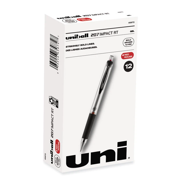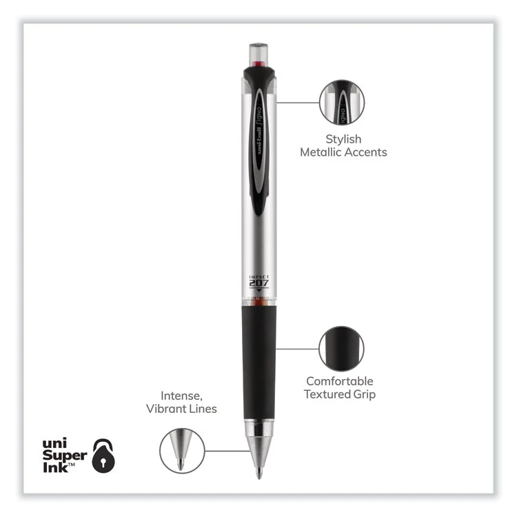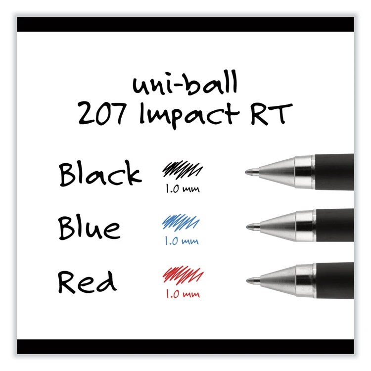 Make an impact with 207 IMPACT RT Gel Pens from uni-ball featuring a 1.0 mm bold point with a stainless steel tip that resists bending and breaking. Even-flowing, pigment-based gel ink renders an outstanding ink laydown for a smooth writing experience and strikingly bold lines. Use these retractable gel pens for everyday writing tasks, check signing and all of your important signatures, trusting its quick-drying uni Super Ink. Exclusive uni Super Ink technology entrenches the gel ink deep into the paper, preventing document alteration, water damage or fading. The 1.0 mm point delivers bold writing with a silky finish. A soft rubber grip helps you continue writing without fatigue while maintaining precision and detail throughout your tasks, and when your writing is complete, the innovative clip auto retracts the tip, protecting against unwanted gel ink marks and stains. Lend a vivid touch to your writing with these sophisticated retractable gel pens that glide smoothly for distinct and neat writing.