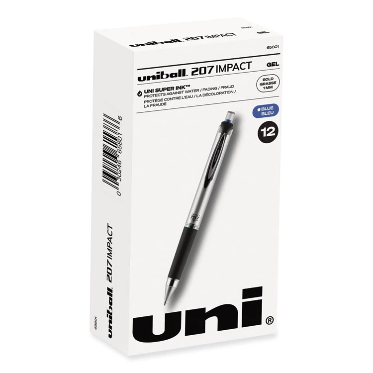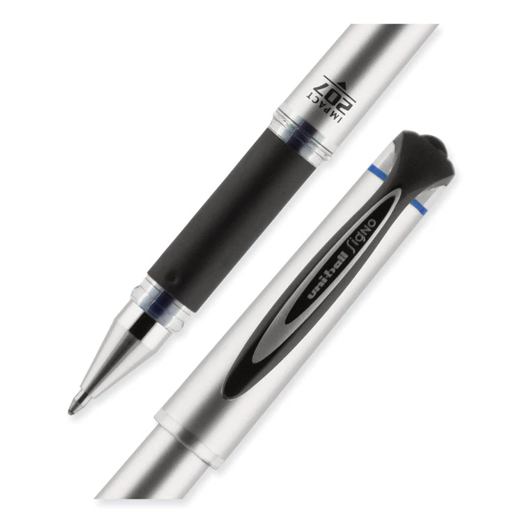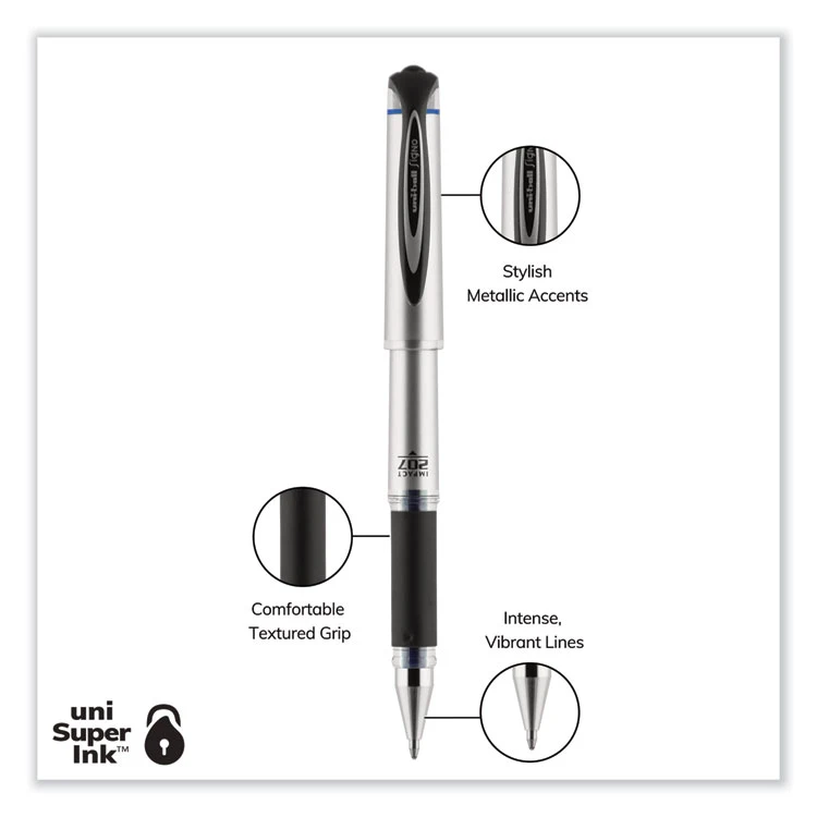 Make an impact with 207 IMPACT Gel Stick Pens from uni-ball featuring a 1.0 mm bold point with a stainless steel tip that resists bending and breaking. Even-flowing, pigment-based gel ink renders an outstanding ink laydown for a smooth writing experience and strikingly bold lines. Use these capped stick gel pens for everyday writing tasks, check signing and all of your important signatures, trusting its quick-drying uni Super Ink. Exclusive uni Super Ink technology entrenches the gel ink deep into the paper, preventing document alteration, water damage or fading. The 1.0 mm point delivers bold writing with a silky finish. A soft rubber grip helps you continue writing without fatigue while maintaining precision and detail throughout your tasks. Lend a vivid touch to your writing with these sophisticated gel stick pens that glide smoothly for distinct and neat writing.