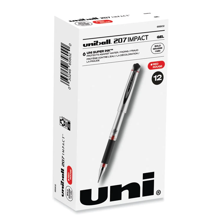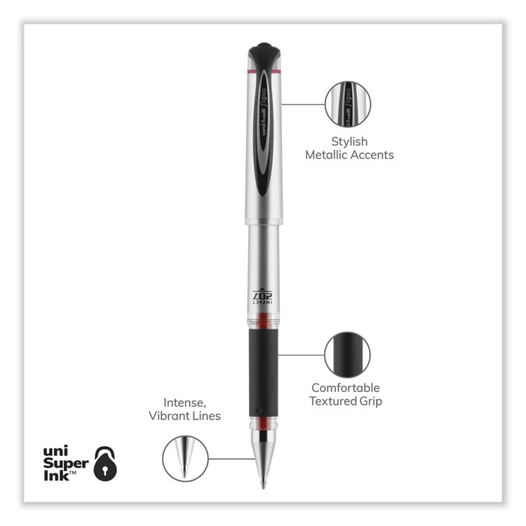 Make an impact with 207 IMPACT Gel Stick Pens from uni-ball featuring a 1.0 mm bold point with a stainless steel tip that resists bending and breaking. Even-flowing, pigment-based gel ink renders an outstanding ink laydown for a smooth writing experience and strikingly bold lines. Use these capped stick gel pens for everyday writing tasks, check signing and all of your important signatures, trusting its quick-drying uni Super Ink. Exclusive uni Super Ink technology entrenches the gel ink deep into the paper, preventing document alteration, water damage or fading. The 1.0 mm point delivers bold writing with a silky finish. A soft rubber grip helps you continue writing without fatigue while maintaining precision and detail throughout your tasks. Lend a vivid touch to your writing with these sophisticated gel stick pens that glide smoothly for distinct and neat writing.