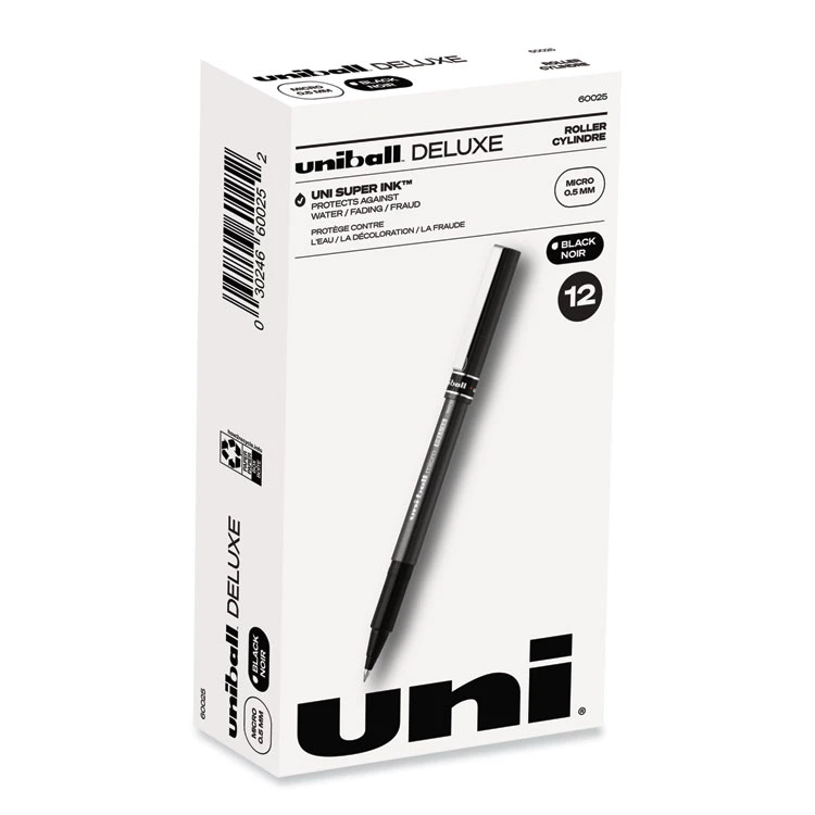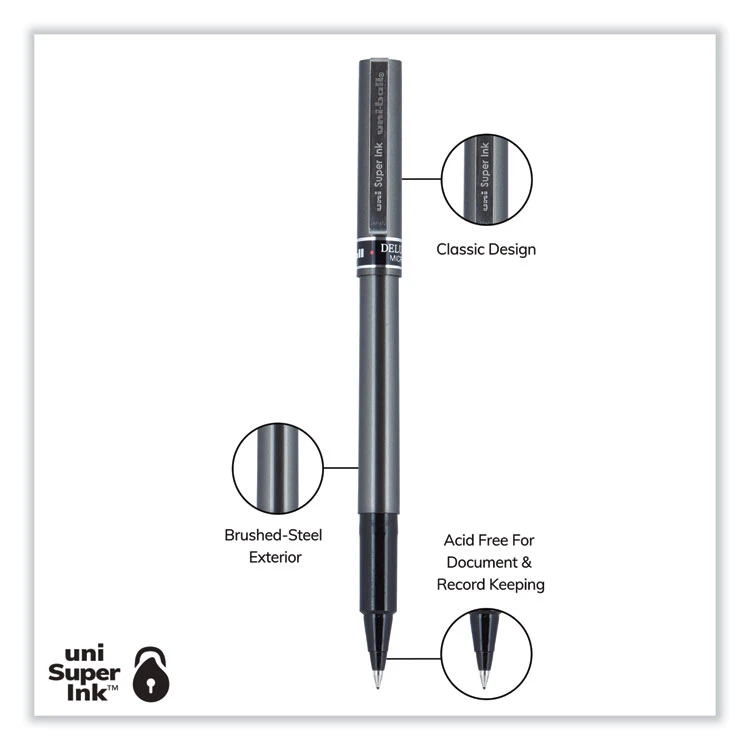 Introduce sophisticated style to your everyday writing with Deluxe Rollerball Stick Pens from uni-ball featuring a strong, long lasting tip. Even-flowing, acid-free liquid ink delivers a smooth writing experience for intense, vibrant lines. Deluxe delivers crisp lines with unparalleled definition, making it easy to create super fine details in your drawings and diagrams. Capped roller pens are useful for a variety of tasks from note taking and list making to signing checks and legal documents. Innovative uni Super Ink technology forms a strong bond with the paper, protecting from water, fading and fraud. Up your writing instrument sophistication with the matte black, brushed steel barrel of the Deluxe capped rollerball pens.