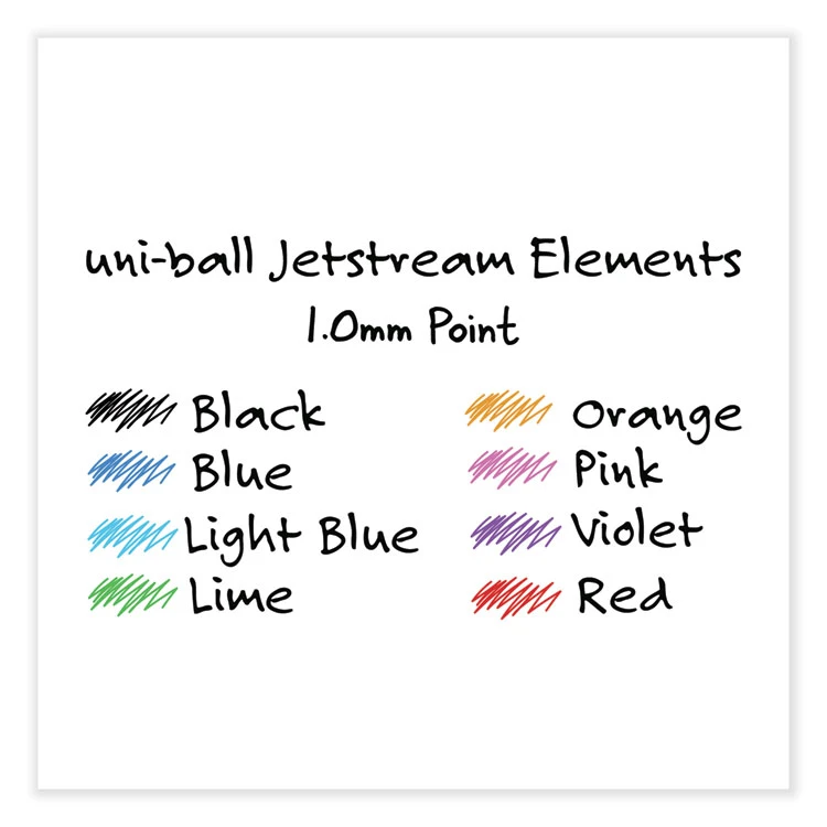 Inspire creativity with Jetstream Elements Ballpoint Pens from uni-ball. These pens feature an innovative hybrid ink that combines the quick-drying properties of a ballpoint with the smoothness and vibrancy of a gel pen. Whether it’s color-coding notes and lists or uniquely embellishing fun and creative writing projects, these JETSTREAM ELEMENTS ballpoint pens are suitable for a variety of projects. A contoured grip ensures greater comfort for extended writing and creating. uni Super Ink technology forms a strong bond with the paper, protecting your work from water, fading and fraud. You are simply left with exceptionally smooth and crisp lines. JETSTREAM ELEMENTS ballpoint pens give all of your ideas a burst of brilliant color.