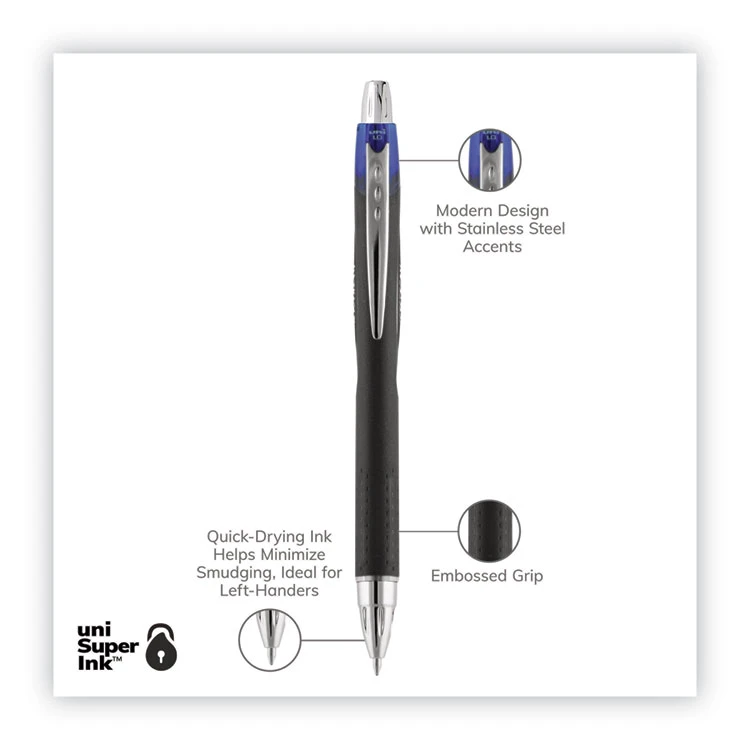 Enjoy your daily writing experience with JETSTREAM RT Retractable Ballpoint Pens from uni-ball. Great pen for everyday writing, these pens contain unique hybrid ink that delivers the smoothness and vibrant color of a gel pen with the quick-drying properties of a traditional ballpoint. JETSTREAM RT pens dry as quickly as you write, which prevents smudging and smearing to produce neat-looking documents. uni Super Ink technology settles ink particles deep into the paper for protection against water, fading and fraud. Contemporary stainless steel accents offer a stylish appeal while the embossed grip helps maintain precision and control.