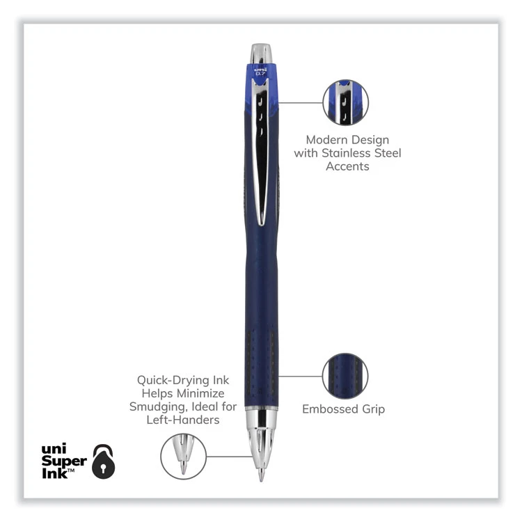 Enjoy your daily writing experience with JETSTREAM RT Retractable Ballpoint Pens from uni-ball. Great pen for everyday writing, these pens contain unique hybrid ink that delivers the smoothness and vibrant color of a gel pen with the quick-drying properties of a traditional ballpoint. JETSTREAM RT pens dry as quickly as you write, which prevents smudging and smearing to produce neat-looking documents. uni Super Ink technology settles ink particles deep into the paper for protection against water, fading and fraud. Contemporary stainless steel accents offer a stylish appeal while the embossed grip helps maintain precision and control.