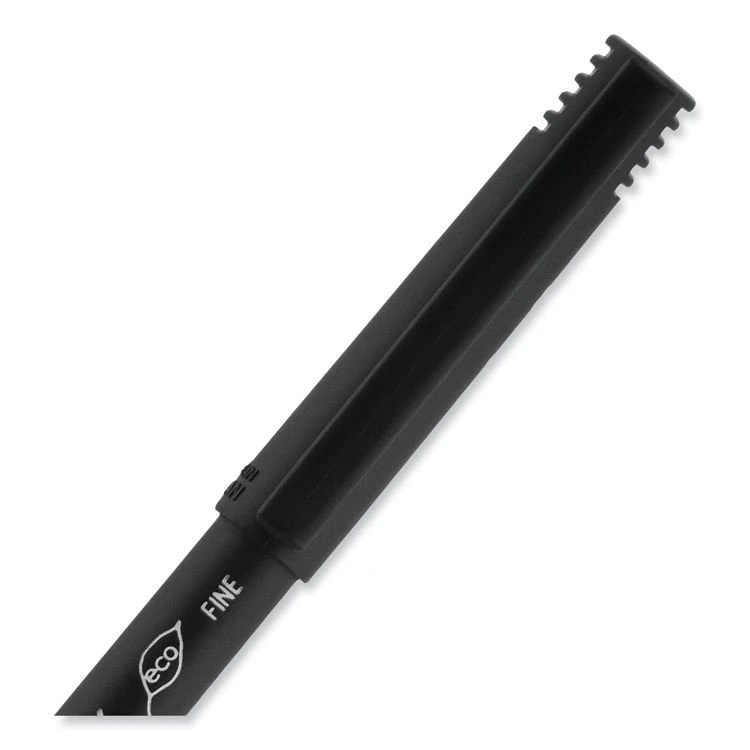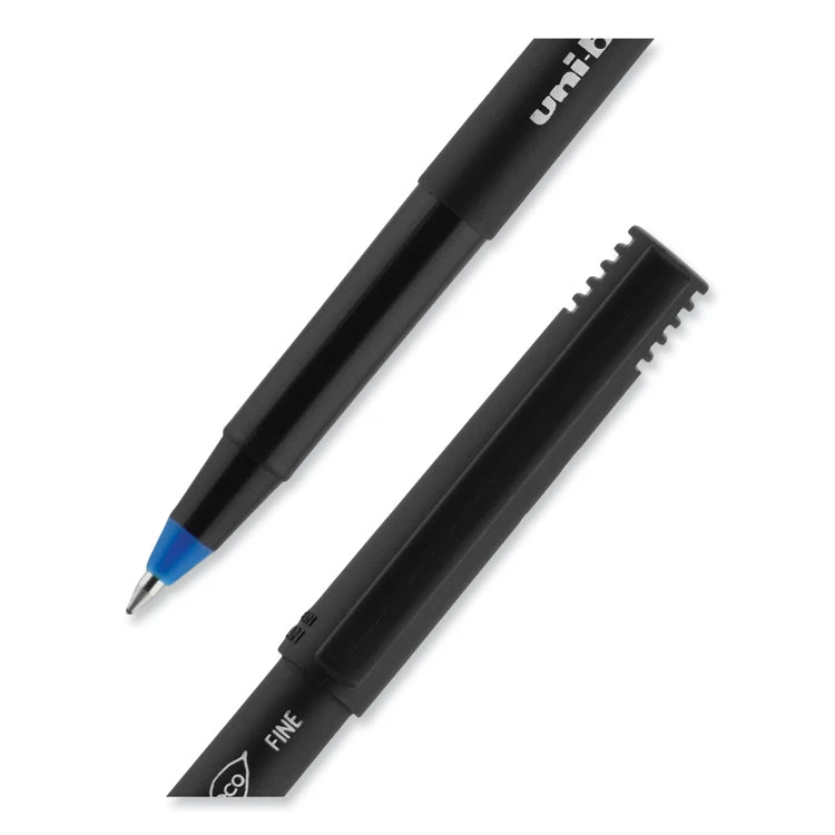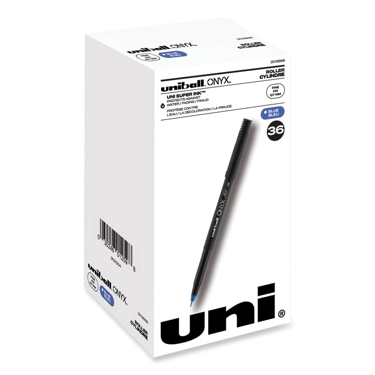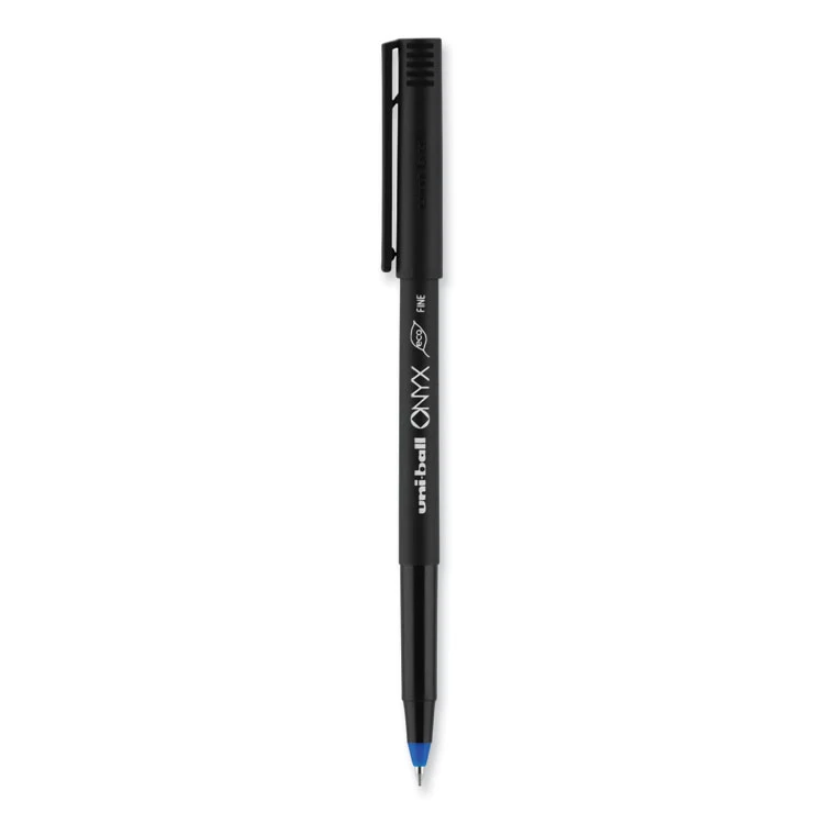 Stock your office, home or classroom with Onyx Rollerball Stick Pens from uni-ball featuring strong, long lasting tip sizes. This rollerball pen delivers the silky-smooth glide of a fountain pen without smudging for effortless writing. ONYX pens produce crisp and precise lines for intricate writing, making it easy to create super fine details in your drawings and diagrams. Capped roller pens are useful for a variety of tasks from note taking to signing checks and legal documents to uniquely embellishing fun and creative writing projects. Innovative uni Super Ink technology forms a strong bond with the paper, protecting from water, fading and fraud. A great economic and environmentally-conscious choice as this super sleek micro point roller pen is made from post-consumer recycled material.