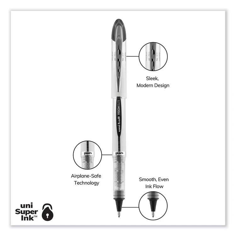 Create ideas as vividly as can be imagined with Vision Elite Rollerball Pens from uni-ball featuring a bend-resistant stainless steel tip and a tungsten carbide rollerball. Capped roller pens deliver smooth, intense lines with unparalleled definition – useful for note taking, list making, signing checks and legal documents, and even uniquely embellishing creative writing projects. Innovative uni Super Ink technology effectively entraps the gel ink into the paper, producing fraud, fade and water-resistant documents that resist check washing or bleaching. These Vision Elite pens have a special design that withstands cabin pressure variances without leaking, making them useful for travelers. Exclusive Uni-Flow Ink System ensures a consistent, delightfully fluid writing experience, and a translucent window ensures that you don’t run out of ink unexpectedly. Express your signature style with the sleek, modern design and elite performance of uni-ball’s Vision Elite Rollerball pen – no matter the altitude.