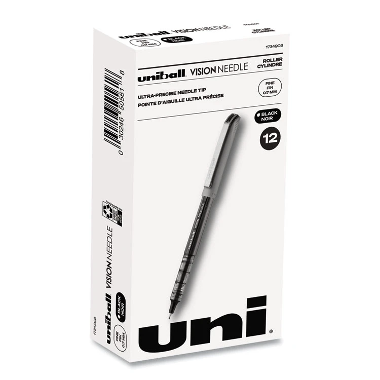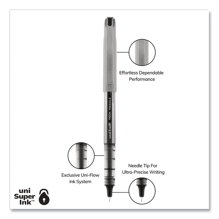 Stock your office, home or classroom with Vision Needle Stick Rollerball Pens from uni-ball featuring a strong, long lasting 0.7 mm fine point. These needle point pens are designed with a bend resistant tip for better accuracy. Even-flowing, pigment-based roller ink delivers a smooth writing experience for reliably smooth, vivid lines and a rich color for improved clarity and readability. Use these fine point rollerball pens to create perfect letters, numbers and graphics. Innovative uni Super Ink technology effectively entraps the liquid ink into the paper, producing fraud, fade and water-resistant documents that resist check washing or bleaching. The 0.7mm fine needle point allows you to create ultra-precise, straight edge lines with ease. The exclusive Uni-Flow Ink System ensures a consistent, delightfully fluid writing experience, and a translucent window ensures that you don’t run out of ink unexpectedly. Enjoy beautiful clean lines and give all of your ideas a burst of brilliant color with this classic style fine point rollerball pen.