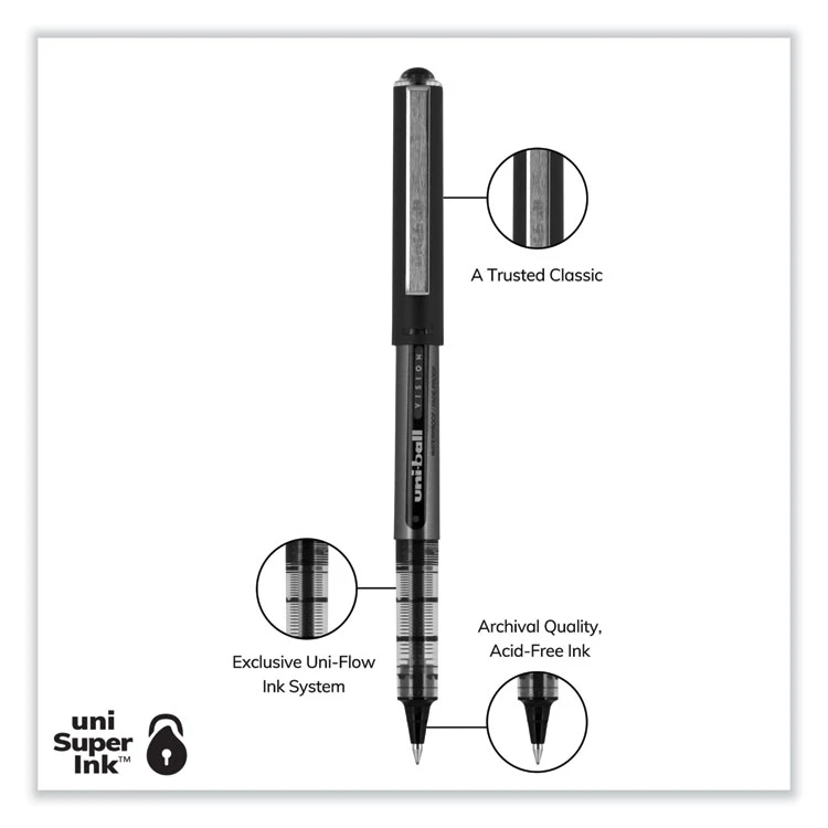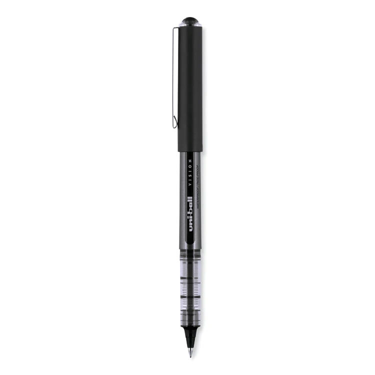 Make your everyday writing easy with the effortless and dependable performance of Vision Rollerball Pens from uni-ball featuring strong, long lasting tips. Capped roller pens deliver an even liquid ink lay-down for reliably smooth, vivid lines and a rich color for improved clarity and readability. Great for all writing tasks from taking notes to record keeping with archival quality, acid free roller ink. Innovative uni Super Ink technology forms an indestructible bond with the paper to minimize the risk of check washing or document fraud, while also protecting from water and fading. The exclusive Uni-Flow Ink System ensures a consistent, delightfully fluid writing experience, and a translucent window ensures that you don’t run out of ink unexpectedly. Enjoy beautiful clean lines and give all of your ideas a burst of brilliant color with this classic style rollerball pen.