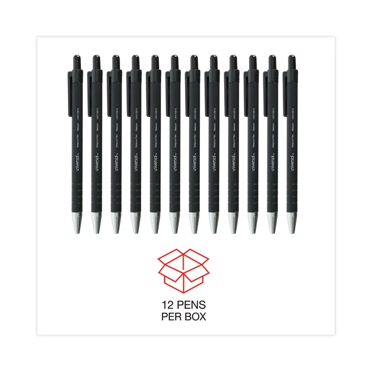 SKU: UNV15510 Category: Pens Tags: Ballpoint Pen, Black Barrel, Black Ink, Dozen, Medium 1 mm, Retractable