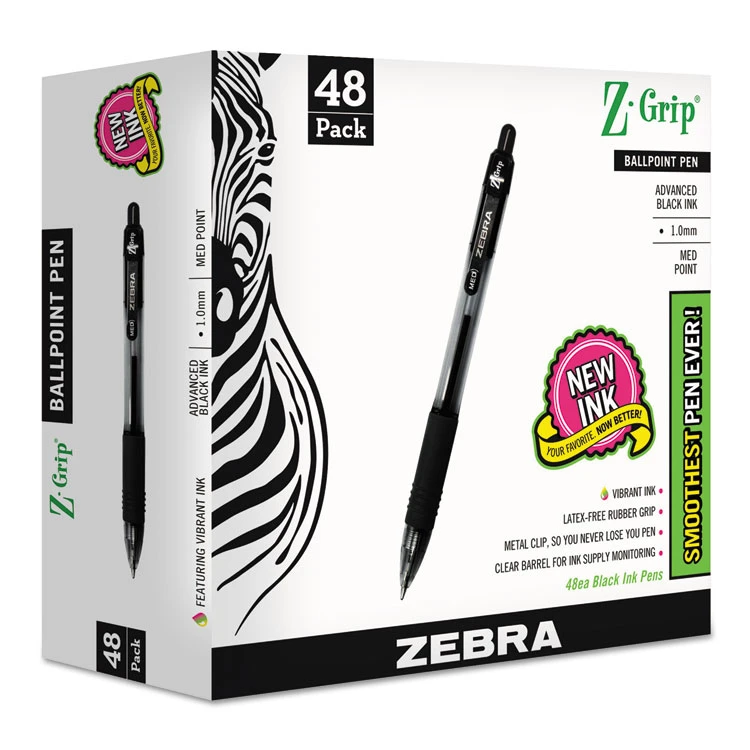 Zebra Z-Grip Ballpoint Pen, Retractable, Medium 1 Mm, Black Ink, Black Barrel, 48/Pack