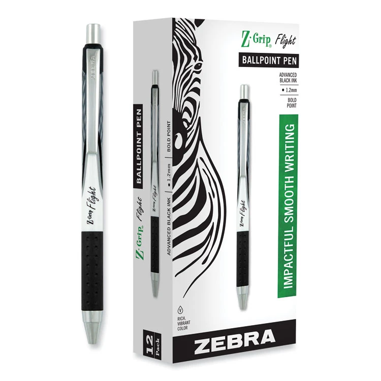 SKU: ZEB21910 Category: Pens Tags: 12/Pack, Black Ink, Bold 1.2 mm, Retractable, White Barrel, Z-Grip Flight Ballpoint Pen